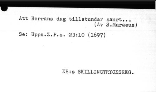 //// Att Herrans dag tillstundar sanrt... //// (Av S.Muraeus) //// Se: Upps.Z.P.s. 23:10 (1697) //// KB:s SKILLINGTRYCKSREG. ////