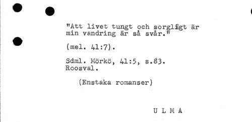 //// "Att livet tungt och sorglagt är //// min vandring är så svår." //// ^ (mel. 41:7). //// % * //// Sdml. Mörkö, 41:5, s.33* //// Roosval. //// (Enstaka romanser) //// t //// i //// U L M A ////