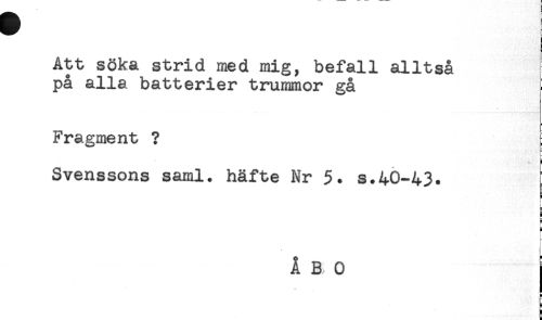 //// Att söka strid med mig, befall alltså //// på alla batterier trummor gå //// * //// Fragment ? //// Svenssons saml. häfte Nr 5. s.40-43. ! //// j //// i //// H //// b //// H //// i //// s ////