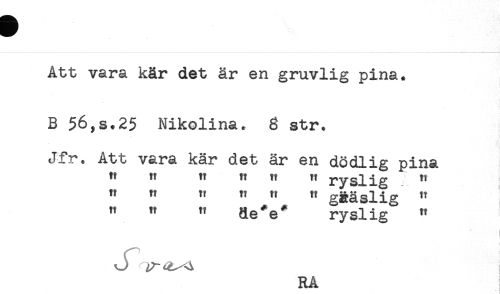 //// Att vara kär det är en gruvlig pina. //// B 56;S.25 Nikolina, g str. //// Jfr, Att vara kär det är en dödlig pina //// " " " " " " ryslig ^ //// " ^ ^ ^ ^ " gääslig ^ //// ^ " " de^e^ ryslig " //// ) //// RA ////