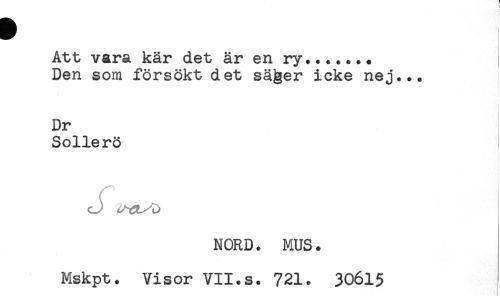 //// Att vara kär det är en ry....... //// Den som försökt det sä^er icke nej... //// Dr //// Sollerö //// i //// ^tt^ } //// NORD. MUS. //// Mskpt. Visor VII.s. 721. 30615 //// : ////