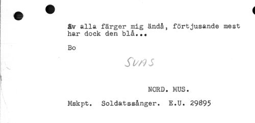 //// alla färger mig ändå, förtjusande mest //// har dock den blå... //// Bo //// . .. //// NORD. MUS. //// t', h //// Mskpt. Soldatssånger. E.U. 29895 ////