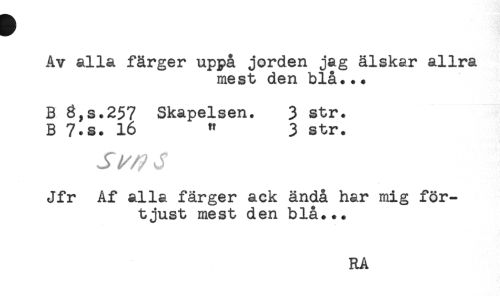 //// Av alla färger uppå jorden jag älskar allra //// mest den blå..* //// B 8,s.257 Skapelsen. 3 str. //// B 7.s. 16 " 3 str. //// J ^/y J //// Jfr Af alla färger ack ändå har mig för- //// tjust mest den blå... //// RA ////