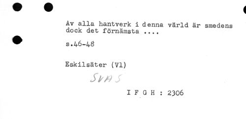 //// Av alla hantverk i denna värld är smedens //// dock det förnämsta .... //// ^ s.46-48 //// Eskilsäter (VI) //// J/-//J //// I F G H : 2306 ////