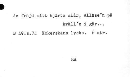 //// Av fröjd mitt hjärta slår, all&se*n på //// kväll*n i går... //// B 49.S.74 Kokerskans lycka. 6 str. //// RA ////