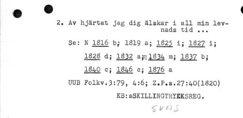 //// 2, Av hjärtat jag dig älskar i all min lev- //// nads tid ... //// ' - . - . //// Se: N 1816 b; 1819 a; 1825 i; 1827 i; //// 1828 d; 1832 a;ql834 m; 1837 b; //// 1840 c; 1846 c; 1876 a //// UUB Folkv.3:79, 4:6; Z.P.s.27:40(1820) //// KB:sSKILLINGTRYEKSREG. ////