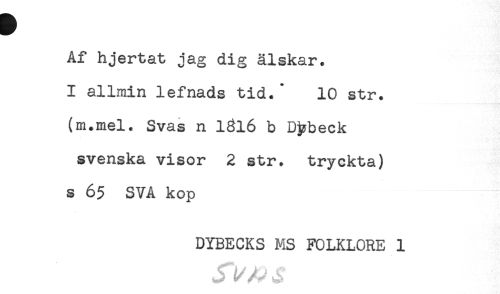 //// Af hjertat jag dig älskar. //// I allmin lefnads tid.* 10 str. //// (m.mel. Svas n 1816 b Dybeck //// svenska visor 2 str. tryckta) //// s 65 SVA kop //// DYBECKS MS FOLKLORE 1 ////