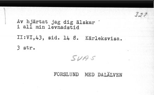//// Av hjärtat jag dig älskar * //// i all min levnadstid //// * - //// II:VI,43, sid. 14 Kärleksvisa. //// 3 str. //// < //// FORSLUND MED DALÄLVEN ////