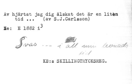 //// Av hjärtat jag dig älskat det är en lit^n //// tid ... (av S.J.Carlsson) //// Se: E 1882 i 3 //// f //// KB:s SKILLINGTRYCKSREG. ////
