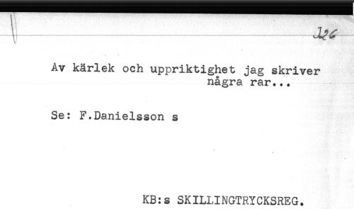 //// 4- ^ //// - //// Av kärlek och uppriktighet jag skriver //// några rar./. //// Se: F.Danielsson s //// * //// K*.' '?< //// KB:s SKILLINGTRYCKSREG. ////