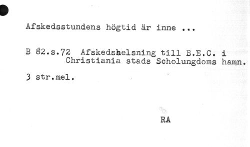 //// Afskedsstundens högtid är inne ... //// B 32.S.72 Afskedshelsning till B.E.C. i //// Christiania stads Scholungdoms hamn. //// 3 str.mel. //// RA ////