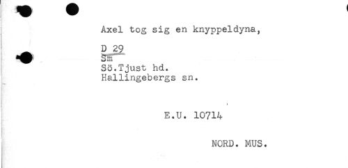 //// ; Axel tog sig en knyppeldyna, //// D 29 //// Sö.Tjust hd. //// Hallingebergs sn. //// ) //// 9 //// E.U. 10714 //// NORD. MUS. ////