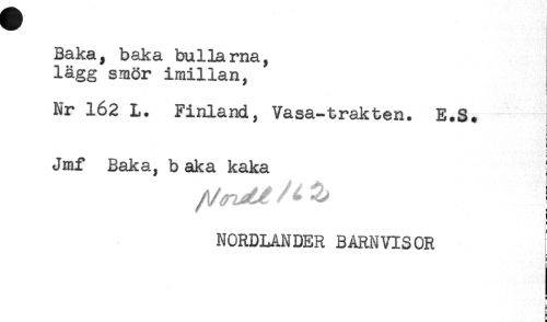 //// Baka, baka bullarna, //// lägg smör imillan, //// Nr 162 L. Finland, Vasa-trakten. E.S. //// t //// i //// - //// Jmf Baka, b aka kaka ; //// } //// NORDLANDER BARNVISOR ' //// < //// ** //// h //// c //// É //// ä ////