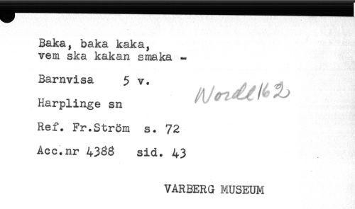 //// Baka, baka kaka, //// vem ska kakan smaka - //// Barnvisa $ v. ^ ^ //// Harplmge sn //// Ref. Fr.Ström s. 72 //// Acc.nr 438g sid. 43 //// VARBERG MUSEUM ////