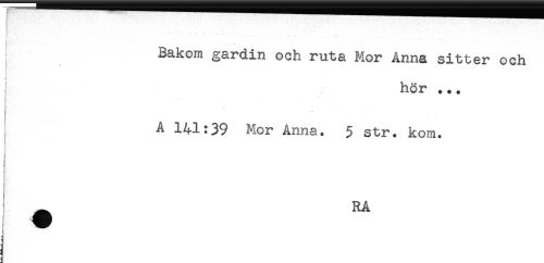 //// Bakom gardin och ruta Mor Anna sitter och //// : //// ' hör ... //// ? //// : //// A 141:39 Mor Anna. $ str. kom. //// ^ RA //// . - ////