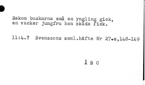 //// Bakom buskarna små en yngling gick, //// en vacker jungfru han skåda fick. //// 11:4.? Svenssons saml.häfte Nr 27*s,143-149 //// ÅBO ////