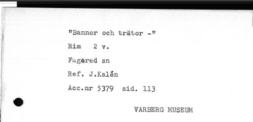 //// - ! //// !?<'.'< - 9 //// j S //// t ^ //// "Bannor och trätor //// i) //// Rim 2 v. //// K //// Fag^red sn //// ; //// ! Ref. J.Kålen //// ! - - //// Acc.nr 5379 sid. 113 //// VARBERG MUSEWi ////