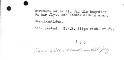 //// I ^ Barndoms sälla tid jag dig begråter //// j Du har flytt och kommer aldrig åter. //// Barndomstiden. //// 6:4. J-stad. I.N.E. Slips visb. nr 69. //// ÅBO ////