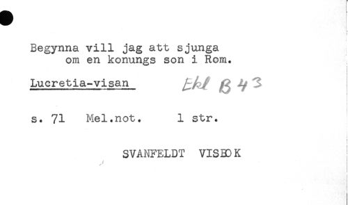 //// I- //// - t //// I //// Begynna vill jag att sjunga //// om en konungs son i Rom. //// i //// Lucretia-visan ^Af ^ ^ 3 //// t //// t //// - //// t //// s. 71 Mel.not. 1 str. //// SVANFELDT VISBOK ////