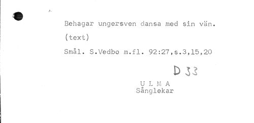 //// Behagar ungersven dansa med sin vän. //// (text) //// i //// Smål. S.Vedbo m.fl. 92:27,s.3,15,20 //// t) ^ //// U L M A //// Sånglekar ////