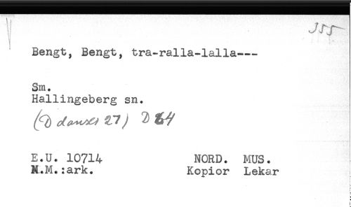 //// Bengt, Bengt, tra-ralla-lalla--- //// Sm. //// Hallingeberg sn. //// E.U. 10714 NORD. MUS. //// N.M.:ark. Kopior Lekar //// i* //// H //// ] ////