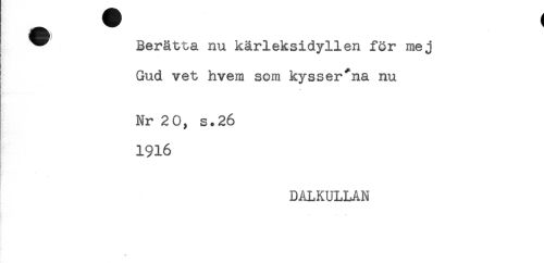 //// ^ Berätta nu kärleksidyllen för mej //// Gud vet hvem som kysser*na nu //// Nr 2 0, s.26 //// 1916 //// DALKULLAN ////