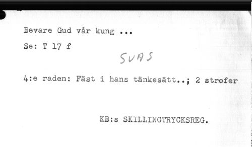 //// Bevare Gud vår kung ... //// Se: T 17 f ! //// 4:e raden: Fäst i hans tänkesätt..; 2 strofer //// < //// < //// i //// i //// j //// KB:s SKILLINGTRYCKSREG. //// t //// *= //// * //// I //// ) //// t ////