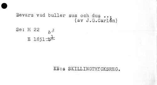 //// t //// Bevars vad buller sus och dus ... //// (av J.G.Carlén) //// Se: M 22 //// E 1851^ //// i* //// t //// i //// i //// KB:s SKILLINGTRYCKSREG. ////