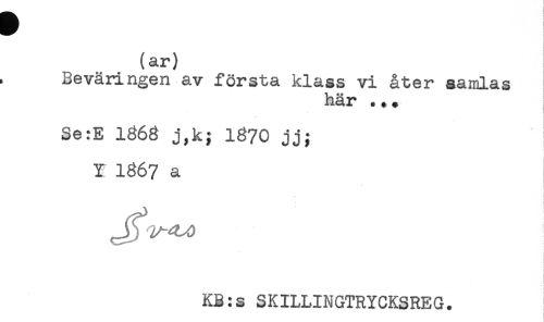 //// (ar) //// Beväringen av första klass vi åter samlas //// här ... //// Se:E 186g j,k; 1870 jj; //// Y 1867 a //// I //// KB:s SKILLINGTRYCKSREG. ////