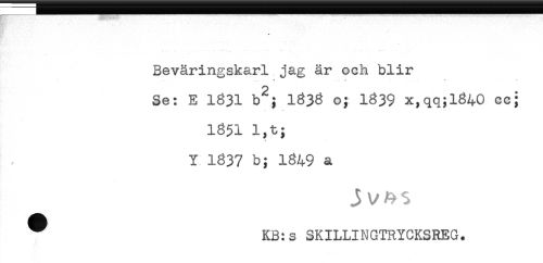 //// [K* ' //// Beväringskarl jag är och blir //// -. - * -. * - . . - - .. * //// Se: E 1831 b^; 1838 o; 1839 x,qq;l840 cc; //// - t- //// 1851 l,t; //// X //// Y 1837 b; 1849 a //// ^ KB:s SKILLINGTRYCKSREG. ////