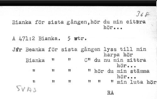 //// Bianka för sista gången,hör du min cittra //// hör... //// A 471:2 Bianka. 5 istr. //// Jfr Beanka för sista gången lyss till min //// harpa hör //// Bianka " ^ C^ du nu min zittra //// hör... //// " " " " hör du min stämma //// hör... //// 'i " " ^ " ^ min luta hör ////
