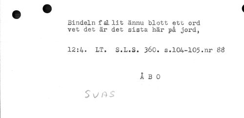 //// Bindeln faLlit ännu blott ett ord //// vet det är det sista här på jord, //// 12:4. LT. S.L.S. 360. s.104-10$.nr //// . //// ! //// ÅBO ////