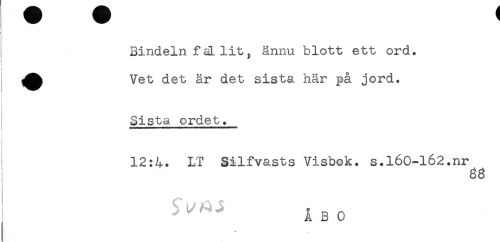 //// ! //// ! //// Bindeln fäLlit, ännu blott ett ord. //// } //// i //// ^^ Vet det är det sista här på jord. //// t Sista ordet. //// I 12:4. LT Silfvasts Visbok. s.l60-l62.nr //// gg //// ÅBO //// 4 _ ////
