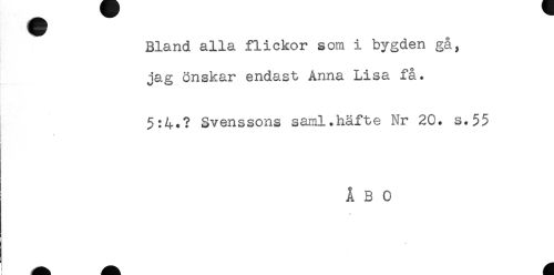 //// Bland alla flickor som i bygden gå, //// jag önskar endast Anna Lisa få. //// 5:4.? Svenssons saml.häfte Nr 20. s.55 //// t //// & //// ÅBO ////