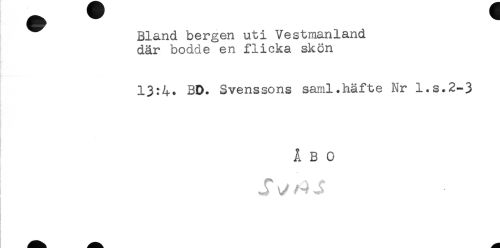 //// Bland bergen uti Vestmanland //// där bodde en flicka skön //// . //// 13:4. BO. Svenssons saml.häfte Nr l.s.2-3 //// ÅBO //// * ////