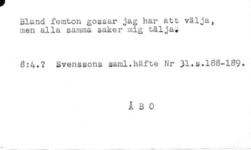 //// Bland femton gossar jag har att välja, //// men alla samma saker mig tälja* //// 8:4.? Svenssons saml.häfte Nr 31.s.188-189* //// ÅBO ////