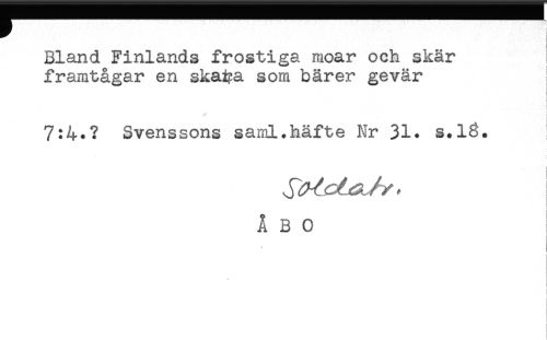 //// Bland Finlands frostiga moar och skär //// framtågar en skaiya som bärer gevär //// t //// 7:4.? Svenssons saml.häfte Nr 31. s.18. //// i //// ÅBO //// * ////