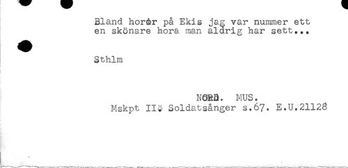//// Bland hor&r på Ekis jag var nummer ett //// en skönare hora man aldrig har sett... //// Sthlm //// NORB. MUS. //// Mskpt 11$ Soldatsånger s.67. E.U.21128 //// * //// * ////