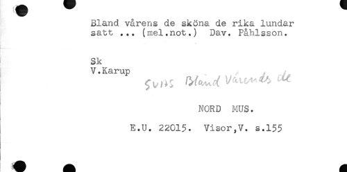 //// Bland vårens de sköna de rika lundar //// satt ... (mel.not.) Dav. Påhlsson. //// .. //// k*-"--...- - //// Sk //// V.Karup //// NORD MUS. //// E.U. 22015. Visor,V. s.l$5 //// - //// ! ////