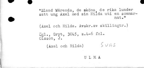 //// "Bland Wärends, de sköna de rika lunder //// satt ung Åxel med sin Hilda uti en sommar- //// ^ nat." //// (Åxel och Hilda. Åvskr.av skillingtr.) //// Ogl., Gryt, 3045, s.4-6 fol. //// I Olsson, J. //// (Åxel och Hilda) $ ^ j; //// } U L M Å ////