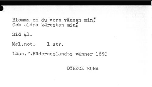 //// Blomma om du vore vännen min? //// Och aldra kärestan minf //// Sid 41* //// Mel.not. 1 str. //// Läsn.f.Fäderneslandts vänner 1850 //// DYBECK RUNA ////