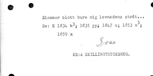 //// Blommor blott bure mig levnadens stråt... //// q //// Se: E 1834 h3; 1835 pp; 1^47 u; 1853 ir; //// 1859 x //// KB:s SKILLINGTRYCKSREG. ////