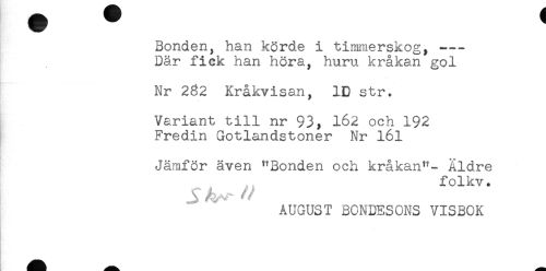 //// Bonden, han körde i timmerskog, -- //// Där fick han höra, huru kråkan gol //// Nr 232 Kråkvisan, ID str. //// Variant till nr 93, 162 och 192 //// Fredin Gotlandstoner Nr l6l //// - //// Jämför även "Bonden och kråkan"- Äldre //// folkv. //// i J ^ //// AUGUST BONDESONS VISBOK ////