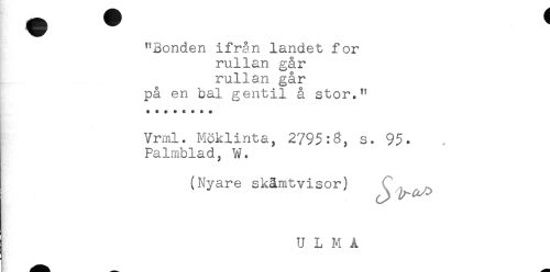 //// "Bonden ifrån landet for //// rullan går //// rullan går //// på en bal gentil å stor." //// Vrml. Möklinta, 2795:3, s. 95. //// Palmblad, W. //// (Nyare skämtvisor) //// U L M A ////