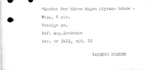 //// "Bonden Per härom dagen olyckan hände - //// ^^ Visa, 8 str. //// Vessige sn. //// R //// H&v //// Ref. Aug.Bondeson //// Acc. nr 3493, sid. 10 //// VARBERG MUSEUM ////