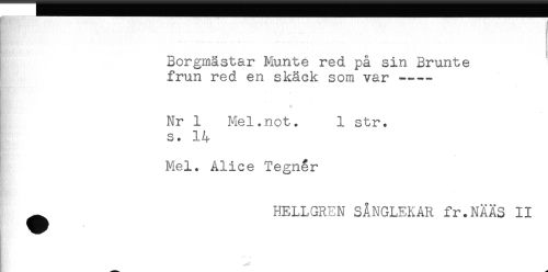 //// Borgmästar Munte red på sin Brunte //// frun red en skäck som var ----- //// Nr 1 Mel.not. 1 str. //// s. 14 //// Mel. Alice Tegner //// ^ HELLGREN SÅNGLEKAR fr.NÄÄS II ////