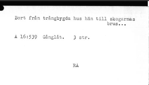 //// ! //// Bort från trångbygda hus hän till skogarnas //// brus... ! //// i //// A 16:539 Gånglåt. 3 str. //// RA //// ? //// ! //// L ////