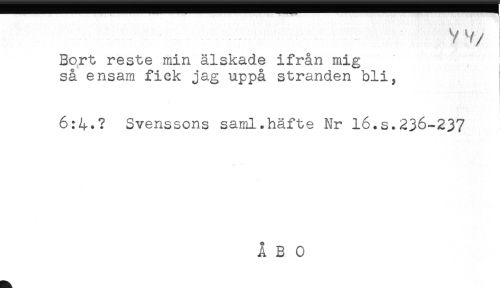 //// Bort reste min älskade ifrån mig //// så ensam fick jag uppå stranden bli, //// 6:4.? Svenssons saml.häfte Nr 16.s.236-237 ////