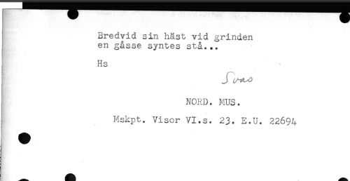 //// Bredvid sin häst vid grinden //// en gåsse syntes stå... //// { Hs //// J //// NORD. MUS. //// Mskpt. Visor VI.s. 23. E.U. 22694 ////