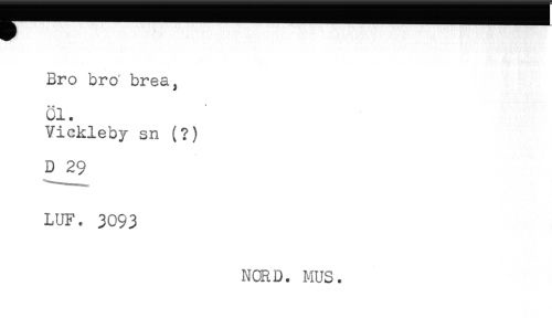//// Bro bro brea, //// Öl. //// Vickleby sn (?) //// D 29 //// LUF. 3093 //// NORD. MUS. ////